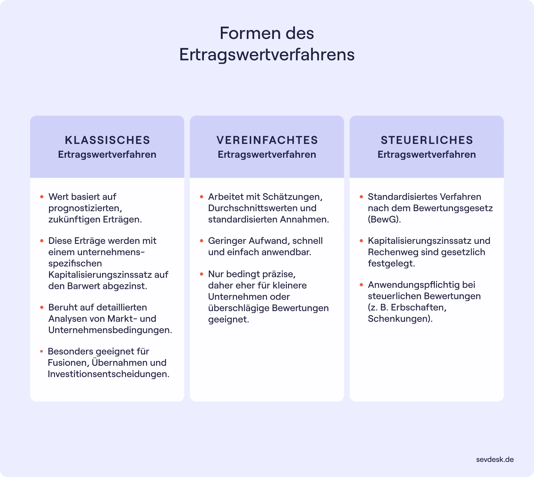 Je nach der Berechnung und der Ausrichtung lassen sich verschiedene Arten des Ertragswertverfahrens unterscheiden: