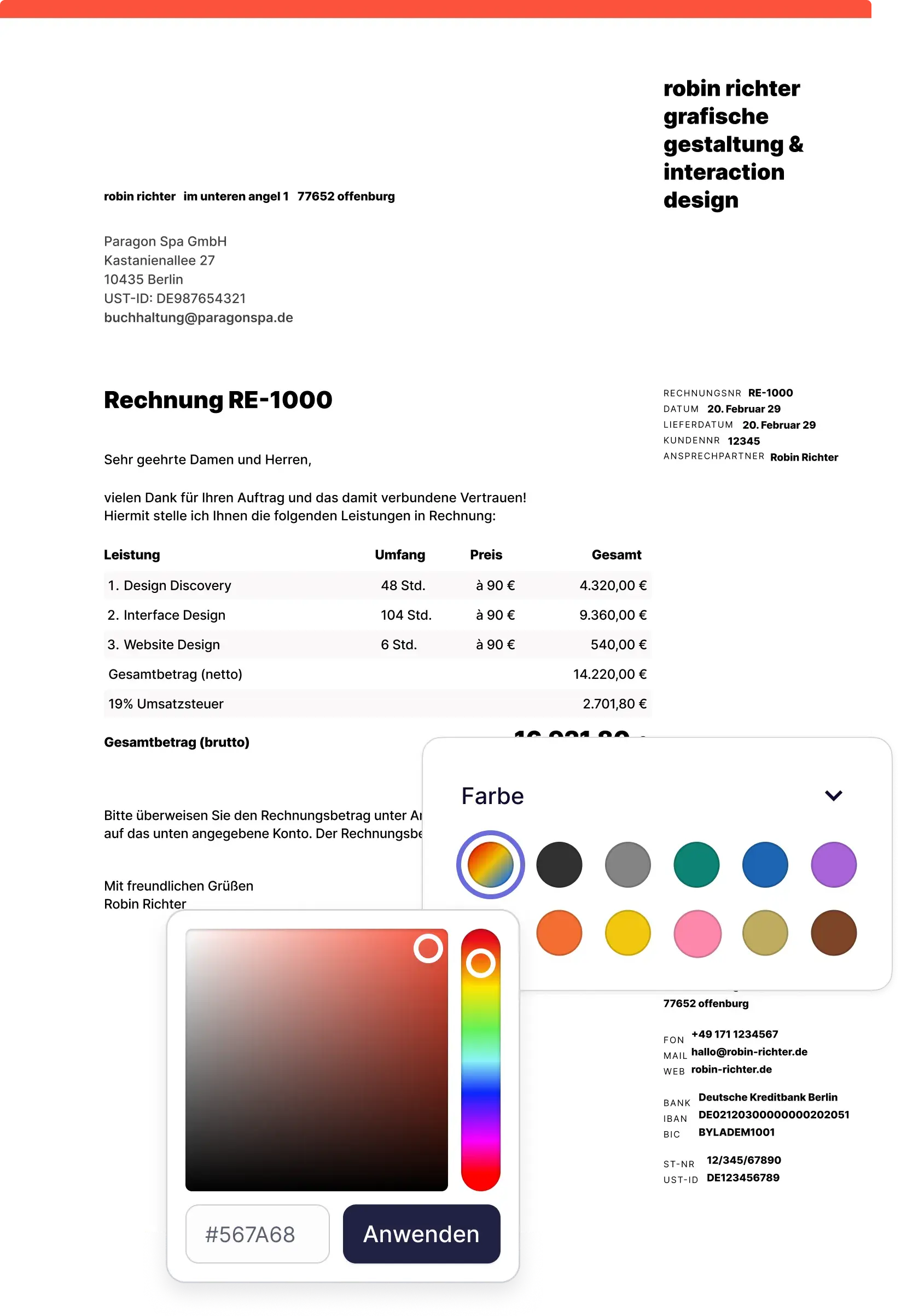 Für noch mehr Auswahl: Nutze das kostenlose Rechnungsprogramm von sevdesk mit einer Vielzahl an Rechnungslayouts in deiner gewünschten Designfarbe.