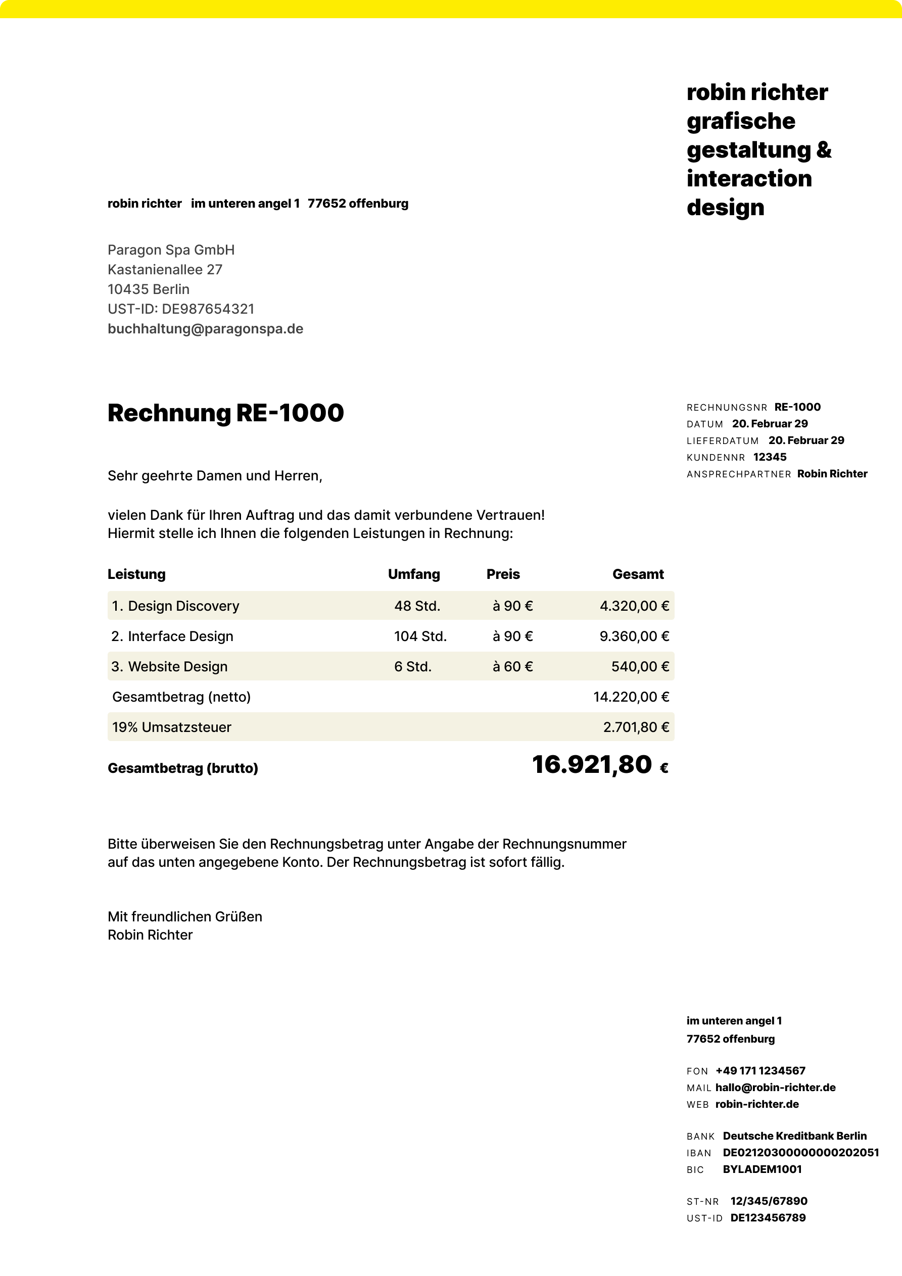 Ein Blick auf deine Eingangsrechnungen zeigt dir sicher, dass es keine standardisierten Vorlagen für Rechnungen zu geben scheint. Im Gegenteil! Wenn sichergestellt ist, dass alle Angaben lesbar und vollständig sind, sind deiner Fantasie hier nur wenige Grenzen gesetzt.