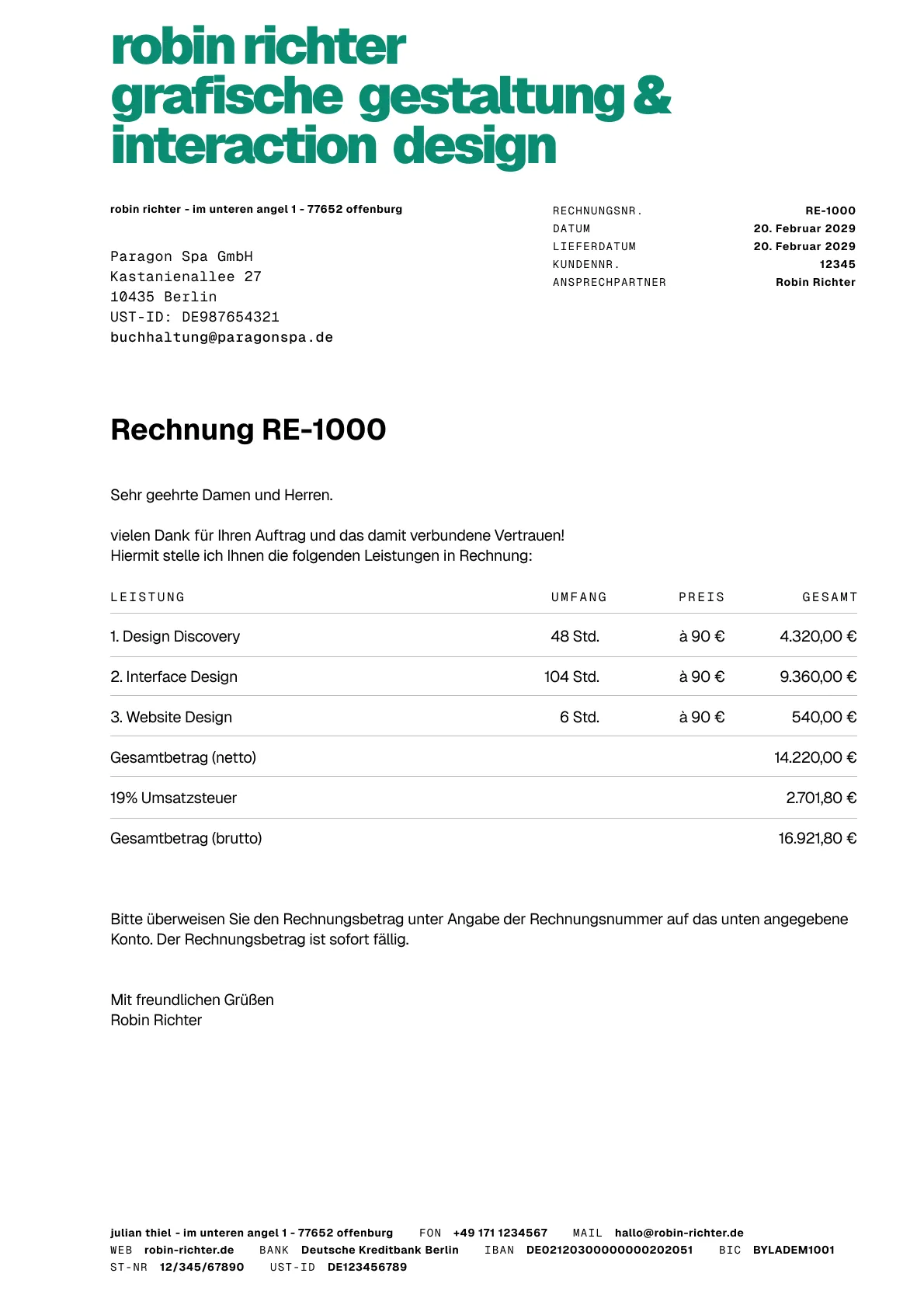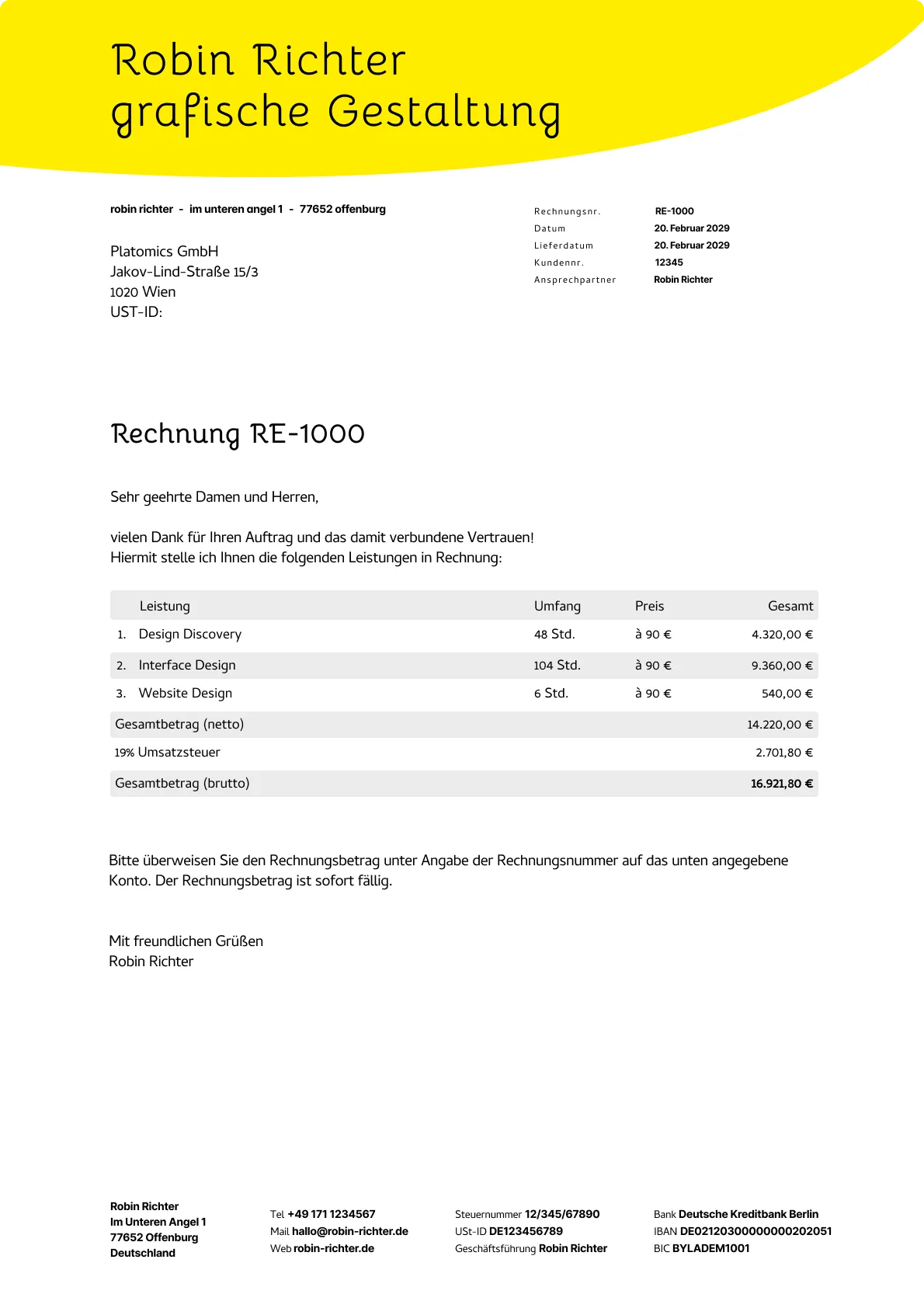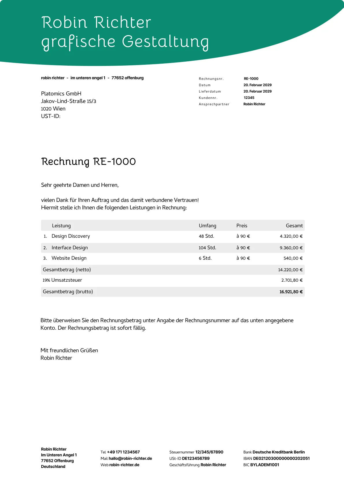 Ein Blick auf deine Eingangsrechnungen zeigt dir sicher, dass es keine standardisierten Vorlagen für Rechnungen zu geben scheint. Im Gegenteil! Wenn sichergestellt ist, dass alle Angaben lesbar und vollständig sind, sind deiner Fantasie hier nur wenige Grenzen gesetzt.