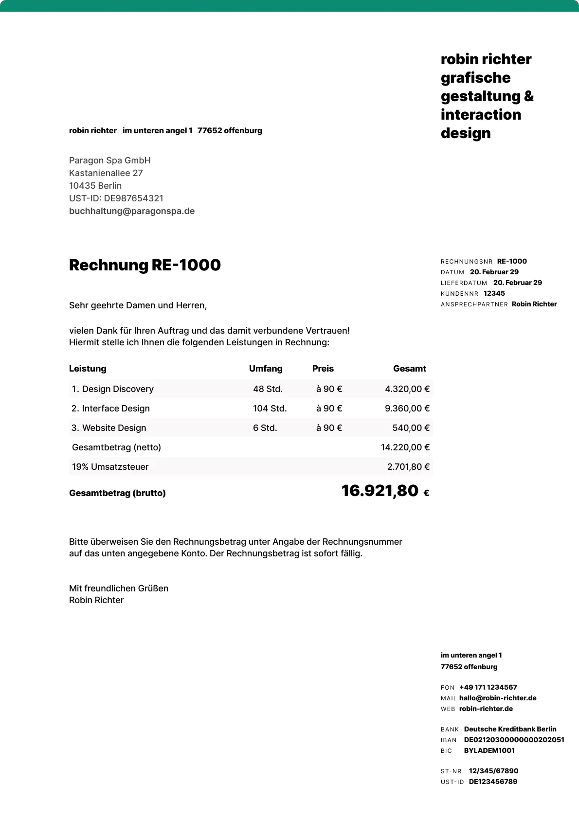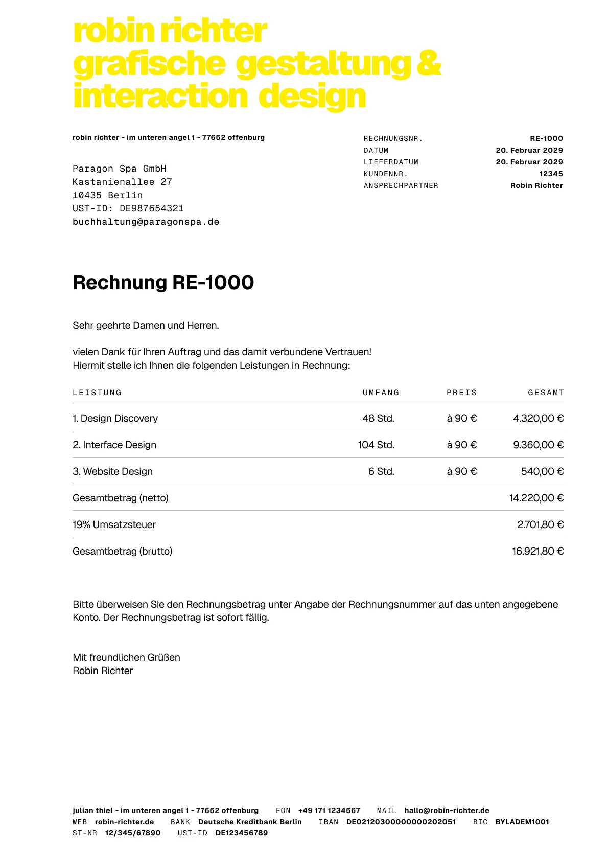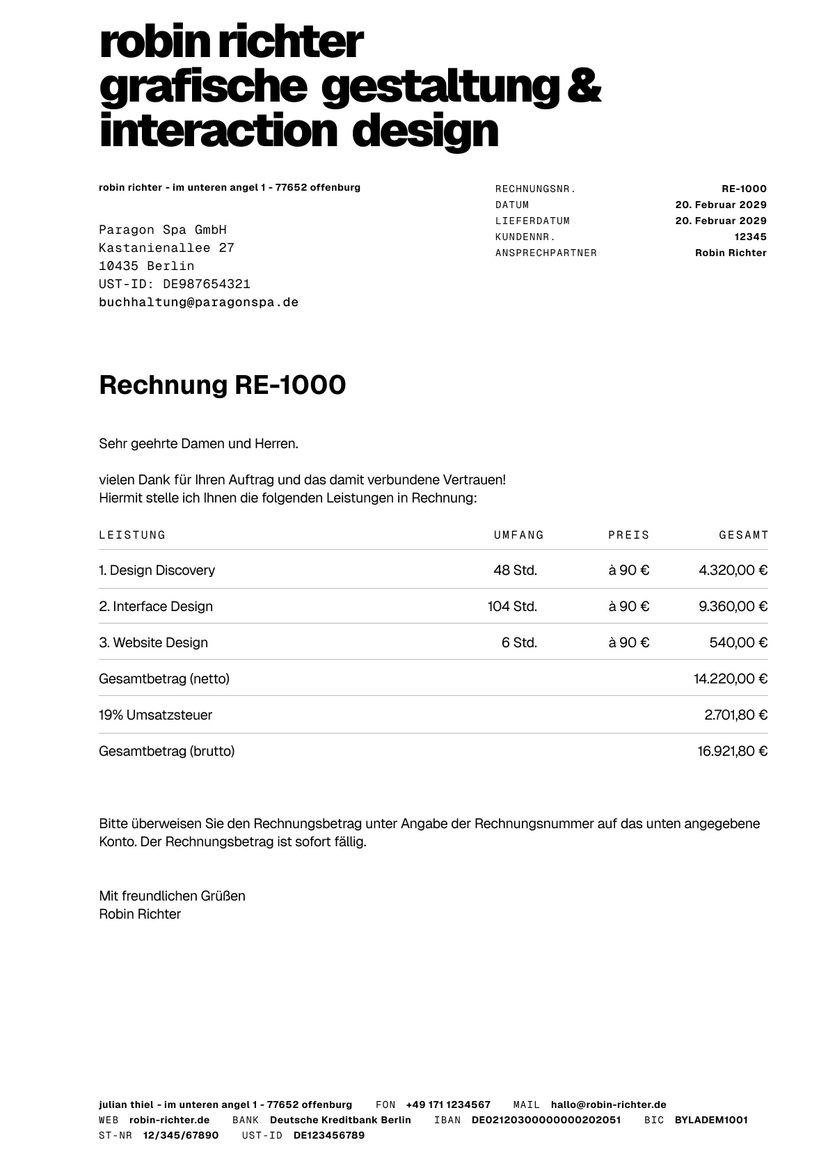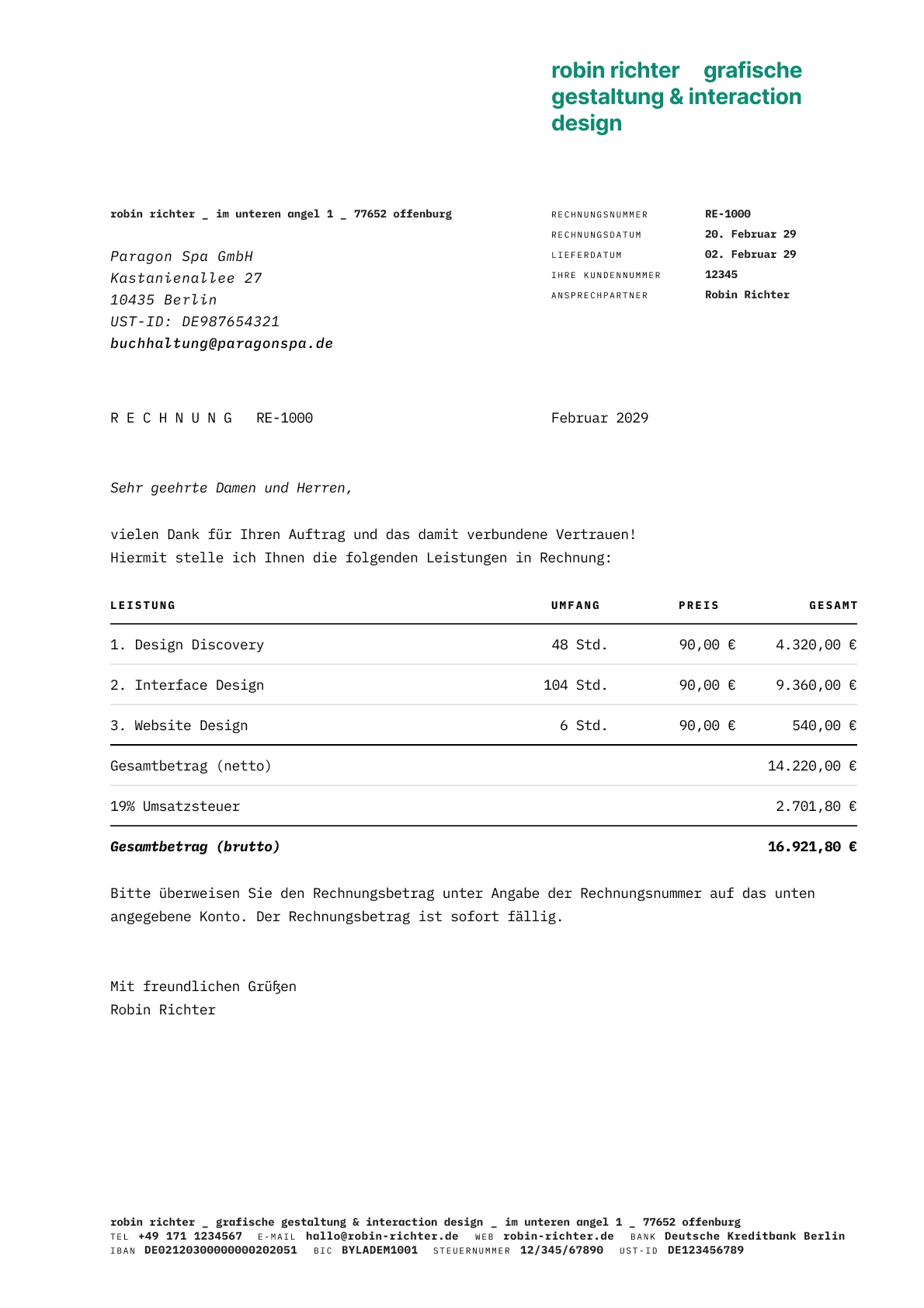 Ein Blick auf deine Eingangsrechnungen zeigt dir sicher, dass es keine standardisierten Vorlagen für Rechnungen zu geben scheint. Im Gegenteil! Wenn sichergestellt ist, dass alle Angaben lesbar und vollständig sind, sind deiner Fantasie hier nur wenige Grenzen gesetzt.